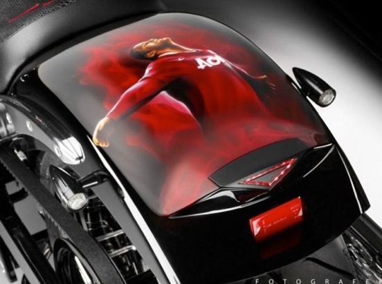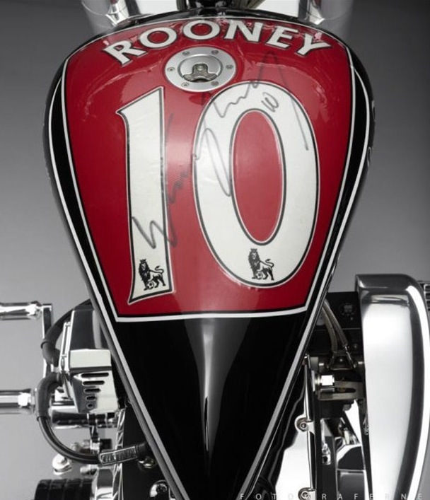 Το σημαντικότερο ατού της μοτοσυκλέτας είναι ότι ενσωματώνει στο ρεζερβουάρ της ένα αυθεντικό μπλουζάκι του Ρούνεϊ με την υπογραφή του.