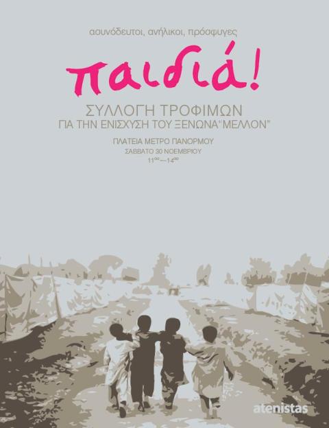 Τρόφιμα για τον ξενώνα φιλοξενίας αιτούντων άσυλο «Μέλλον» συγκεντρώνει αυτό το Σάββατο στην πλατεία του μετρό Πανόρμου, από τις 11:00 έως τις 14:00, η ομάδα plus των Atenistas.