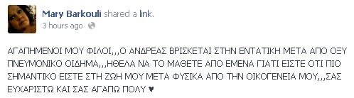 «ΑΓΑΠΗΜΕΝΟΙ ΜΟΥ ΦΙΛΟΙ,,,Ο ΑΝΔΡΕΑΣ ΒΡΙΣΚΕΤΑΙ ΣΤΗΝ ΕΝΤΑΤΙΚΗ ΜΕΤΑ ΑΠΟ ΟΞΥ ΠΝΕΥΜΟΝΙΚΟ ΟΙΔΗΜΑ,,,ΗΘΕΛΑ ΝΑ ΤΟ ΜΑΘΕΤΕ ΑΠΟ ΕΜΕΝΑ ΓΙΑΤΙ ΕΙΣΤΕ ΟΤΙ ΠΙΟ ΣΗΜΑΝΤΙΚΟ ΕΙΣΤΕ ΣΤΗ ΖΩΗ ΜΟΥ ΜΕΤΑ ΦΥΣΙΚΑ ΑΠΟ ΤΗΝ ΟΙΚΟΓΕΝΕΙΑ ΜΟΥ,,,ΣΑΣ ΕΥΧΑΡΙΣΤΩ ΚΑΙ ΣΑΣ ΑΓΑΠΩ ΠΟΛΥ ♥ », αναφέρει στην ανάρτησή της η Μαίρη Μπάρκουλη.