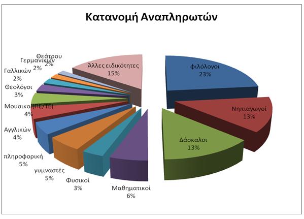 Οι καθηγητές αγγλικών έφθασαν τους 2.945, των γερμανικών τους 1.116 και των γαλλικών τους 1.389. Πολυάριθμες ειδικότητες είναι και αυτές των γυμναστών, των καθηγητών πληροφορικής και των μουσικών. Στους γυμναστές οι αιτήσεις έφθασαν τις 3.546, στους καθηγητές πληροφορικής τις 3051 και στους δυο κλάδους των μουσικών τις 2.775. Στην πρωτοβάθμια εκπαίδευση οι συνολικές αιτήσεις δασκάλων και νηπιαγωγών τις 17.642. Από αυτές οι 8.781 αφορούσαν τους νηπιαγωγούς και οι 8.861 τους δασκάλους. Ο αριθμός των αιτήσεων έφθασε τις 66.363 ενώ αξίζει να σημειωθεί ότι το Υπουργείο έχει ανακοινώσει ότι θα απασχολήσει περίπου 10.000 εκπαιδευτικούς. Από το παρακάτω γράφημα διαπιστώνει κανείς ότι το 55% των αναπληρωτών κατανέμεται σε 4 ειδικότητες, που είναι οι φιλόλογοι (23% αιτήσεων) δάσκαλοι και νηπιαγωγοί (26% αιτήσεων) και οι μαθηματικοί (6%).