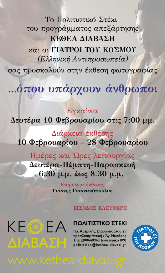 Έκθεση φωτογραφίας διοργανώνουν από κοινού το Πολιτιστικό Στέκι του προγράμματος απεξάρτησης ΚΕΘΕΑ ΔΙΑΒΑΣΗ και οι Γιατροί του Κόσμου-Ελληνική Αντιπροσωπεία.