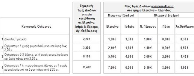 Οι οδηγοί θα πληρώνουν διόδια και στις δύο κατευθύνσεις των σταθμών της Ελευσίνας και του Ισθμού, ενώ θα λειτουργήσουν και πλευρικοί σταθμοί διοδίων στους ανισόπεδους κόμβους Νέας Περάμου και Πάχης Μεγάρων (στους κλάδους εξόδου από Κόρινθο και εισόδου προς Κόρινθο) και στον κόμβο Αγίων Θεοδώρων (στον κλάδο εξόδου από Αθήνα και στον κλάδο εισόδου προς Αθήνα).