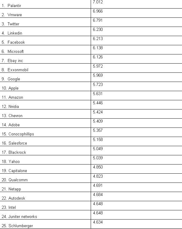 Στη λίστα με τις 25 εταιρείες βρίσκονται το Facebook, Microsoft, Apple, Ebay, Google, Yahoo, Amazon, Nvidia, Adobe. Ο ενεργειακός κολοσσός Exxonmobile βρίσκεται στην 8η θέση, με βάση το μισθό της πρακτικής άσκησης, γεγονός που αποδεικνύει ότι ο ανταγωνισμός για την προσέλκυση λαμπρών νέων επιστημόνων έχει επεκταθεί και σε άλλους τομείς πέρα από αυτόν της τεχνολογίας.
