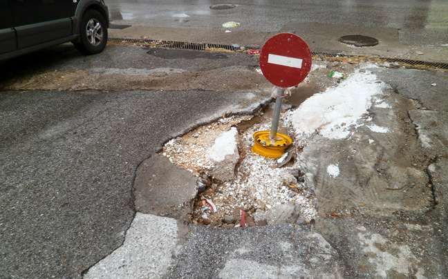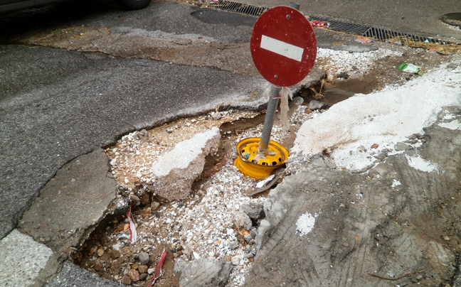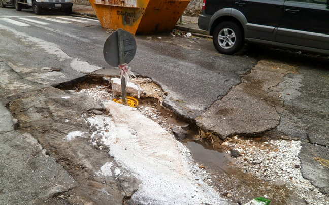 Το οδόστρωμα υποχώρησε δημιουργώντας μια πελώρια χαραμάδα στη μέση ακριβώς του δρόμου, καθιστώντας ιδιαίτερα επικίνδυνη τη χρήση του. Σύμφωνα με τους περιοίκους η έντονη βροχόπτωση των τελευταίων ημερών είχε ως συνέπεια ένα μεγάλο τμήμα της ασφάλτου να το... πάρει το ποτάμι των νερών που κατέβαιναν ορμητικά την οδό, λόγω και την κλήσης του οδοστρώματος. Στη θέση της ασφάλτου εμφανίστηκε μια πελώρια λακκούβα, που θυμίζει περισσότερο ανασκαφές, ενώ στη μέση αυτής τοποθετήθηκε απλώς μια προειδοποιητική πινακίδα, που επισημαίνει τον κίνδυνο στους οδηγούς των Ι.Χ.