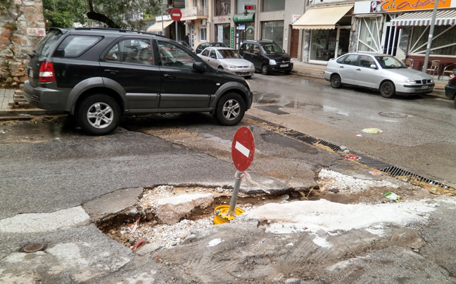 Λακκούβα κίνδυνος-θάνατος στην Ξάνθη λόγω της βροχόπτωσης.