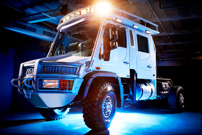 Στα «έξτρα» περιλαμβάνονται τα θωρακισμένα με κέβλαρ λάστιχα, καμιά ντουζίνα συστήματα επικοινωνίας, αλλά και η «καρότσα» φυσικά που έχει μετατραπεί σε οικολογικό σπίτι, ακραία τεχνολογικό.
