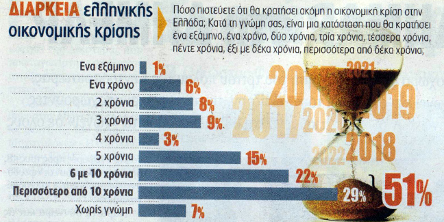 Σύμφωνα με τα ευρήματα, το 90% των Ελλήνων έχασε μεγάλος μέρος του εισοδήματός του, το 31% είναι αντιμέτωποι με τη φτώχεια, το 80% αναγκάστηκε να κάνει περικοπές σε βασικά είδη διατροφής, το 50% δεν είναι σε θέση να καλύψει καθημερινές ανάγκες και το 83% υποχρεώθηκε να κάνει περικοπές και στη θέρμανση του σπιτιού. Παράλληλα, το 40% των πολιτών έχει μη εξυπηρετούμενα χρέη σε τράπεζες και ληξιπρόθεσμες οφειλές σε εφορίες, ενώ ένας στους δύο Έλληνες αντιμετωπίζει τον κίνδυνο να βουλιάξει στα χρέη και να μην μπορεί να ανταποκριθεί στις φορολογικές του υποχρεώσεις.