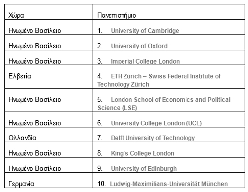 Ενδιαφέρον έχει και η παρουσίαση των 10 κορυφαίων ευρωπαϊκών πανεπιστημίων σύμφωνα με τους «Τάιμς»