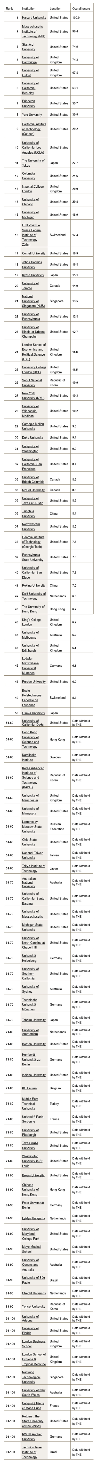 Όσον αφορά τα 10 κορυφαία πανεπιστήμια στον κόσμο για ακόμη μια φορά κυριαρχούν οι ΗΠΑ με 8 εκπροσώπους σε σύνολο 10 θέσεων. Το Ηνωμένο Βασίλειο έχει δυο εκπροσώπους στις θέσεις 4 και 5. Πρόκειται για τα πανεπιστήμια του Κέμπριτζ και του Όξφορντ που είναι και τα 2 κορυφαία ευρωπαϊκά. Ακολουθεί ο πίνακας με τα 100 κορυφαία Πανεπιστήμια: