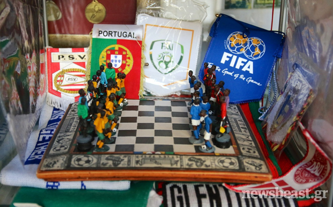 Αλλά δεν είναι μόνο από το ποδόσφαιρο τα κομμάτια που υπάρχουν στη συλλογή του. «Αυτό είναι σκάκι με ποδοσφαιριστές που έφερα από την Αφρική. Ο Βασιλιάς με το κουστούμι αναπαριστά τον πρόεδρο και προπονητή της ομάδας, ο επόπτης είναι αυτός με το σημαιάκι. Αυτό κόστισε 850 ευρώ μόνο» διευκρινίζει αστειευόμενος.
