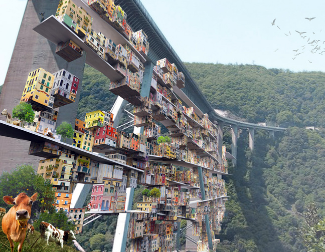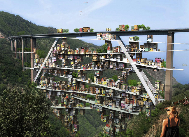 Άλλη μια πρόταση για πόλη μέσα σε γέφυρα, εδώ το πράγμα αντλεί έμπνευση από την παράδοση και συγκεκριμένα από τη φημισμένη κατοικήσιμη γέφυρα Ponte Vecchio της Φλωρεντίας! Η βραβευμένη κονσεπτική δουλειά του καναδικού γραφείου Ja Studio έβαλε σκοπό να μεταμορφώσει δημιουργικά μια γέφυρα σε έναν παροπλισμένο αυτοκινητόδρομο στην Καλαβρία της Ιταλίας, τοποθετώντας το νέο αστικό κέντρο μέσα σε ήδη υπάρχουσα υποδομή, παρέχοντας έτσι απίστευτη θέα αλλά και διαθέτοντας πολύ μικρό οικολογικό αποτύπωμα στον περιβάλλοντα χώρο.