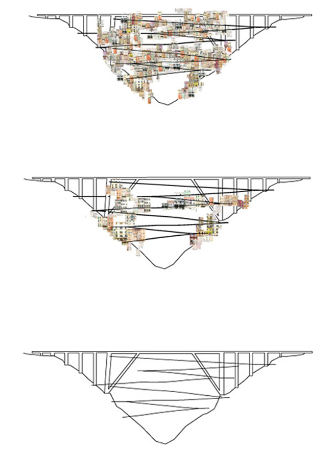 Η φαντασμαγορική πρόταση της κατοικήσιμης γέφυρας αντλεί μεν έμπνευση από την υπέροχη Ponte Vecchio της Φλωρεντίας, όπου φιλοξενεί πράγματι μια χούφτα κατοικιών στο εσωτερικό της, εδώ όμως μιλάμε για εντελώς άλλες κλίμακες, καθώς η κρεμαστή άτυπη πόλη αποτελείται από μια σειρά τυχαίων δομών που αυτό-οργανώνονται για να δημιουργήσουν ένα πλήρες αστικό δίκτυο με ιδιωτικούς και δημόσιους χώρους.