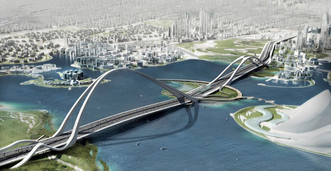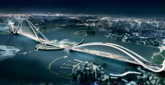 Ο σχεδιασμός, από τη νεοϋορκέζικη φίρμα FXFowle, φαίνεται να αψηφά τους φυσικούς νόμους: με 12 λωρίδες κυκλοφορίας, δύο ράγες για το μετρό του Ντουμπάι και ένα τεχνητό νησάκι που θα φιλοξενεί τη λυρική σκηνή της πόλης, η θεόρατη γέφυρα θα παρέχει πρόσβαση σε χιλιάδες ανθρώπους την ώρα.