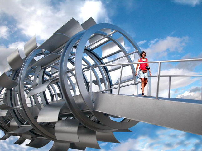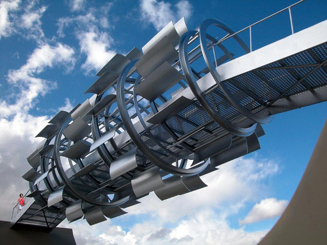 Θα μπορούσαν οι γέφυρες, πέρα από ανθρώπινη πρόσβαση, να χρησιμοποιηθούν και για την παραγωγή ενέργειας; Αν είσαι το concept του Michael Jantzen, όλα γίνονται! Η πεζογέφυρα του αρχιτέκτονα διαθέτει μια σειρά από ανεμογεννήτριες που περιστρέφονται γύρω από τον διαβάτη καθώς αυτός διασχίζει τη γέφυρα.
