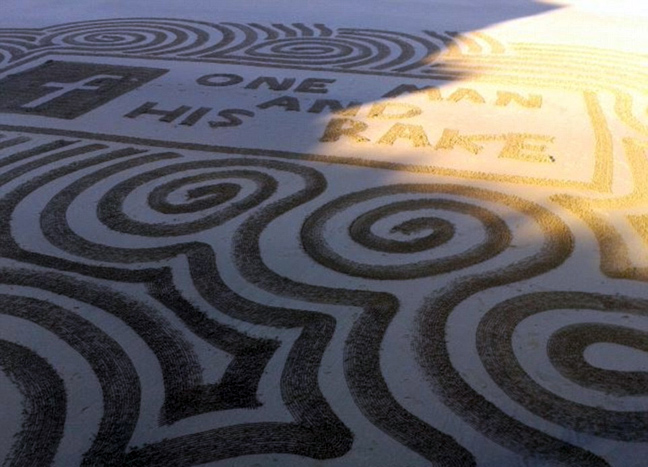 Ο καλλιτέχνης χρησιμοποιεί μόνο μια τσουγκράνα, για να σχεδιάσει εντυπωσιακά σχέδια στη άμμο γνωρίζοντας καλά ότι πολύ σύντομα θα εξαφανιστούν από την παλίρροια.