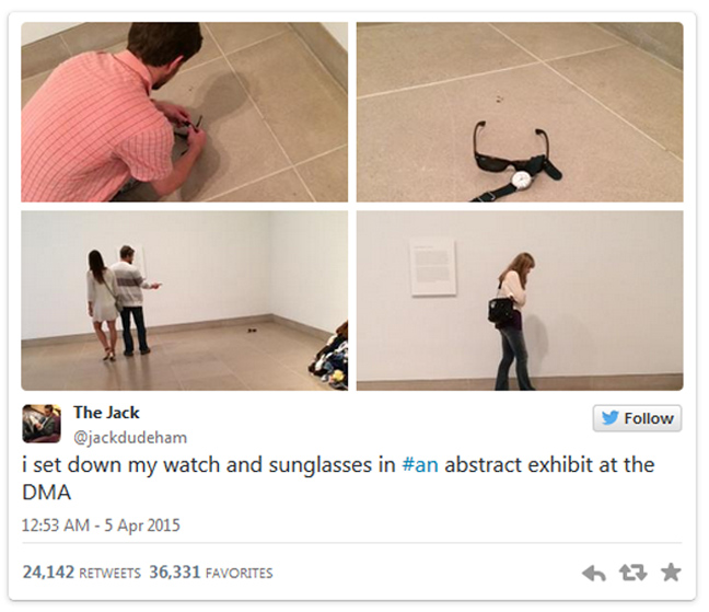 Ο χρήστης του Twitter με το όνομα Jack, τοποθέτησε στο πάτωμα του Μουσείου τέχνης του Ντάλας (Dallas Museum of Art) τα γυαλιά ηλίου και το ρολόι του και περίμενε πώς θα ανταποκρίνονταν οι επισκέπτες στη θέα αυτή.