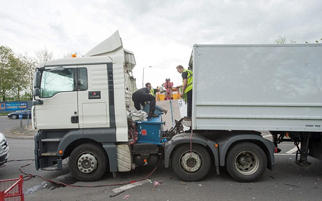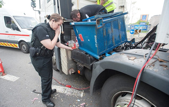 Ένοπλοι αστυνομικοί φυλάσσουν ένα φορτηγό και το φορτίο του που χύθηκε σε δρόμο του Wiltshire στη Βρετανία.