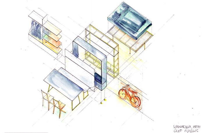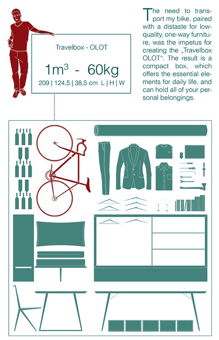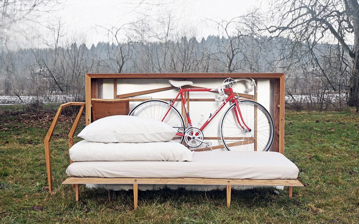 Παρά το μικρό του μέγεθος, το Travelbox χωρά μέσα του ένα πτυσσόμενο κρεβάτι, ένα τραπέζι και καρέκλες, ρούχα και ένα ποδήλατο.