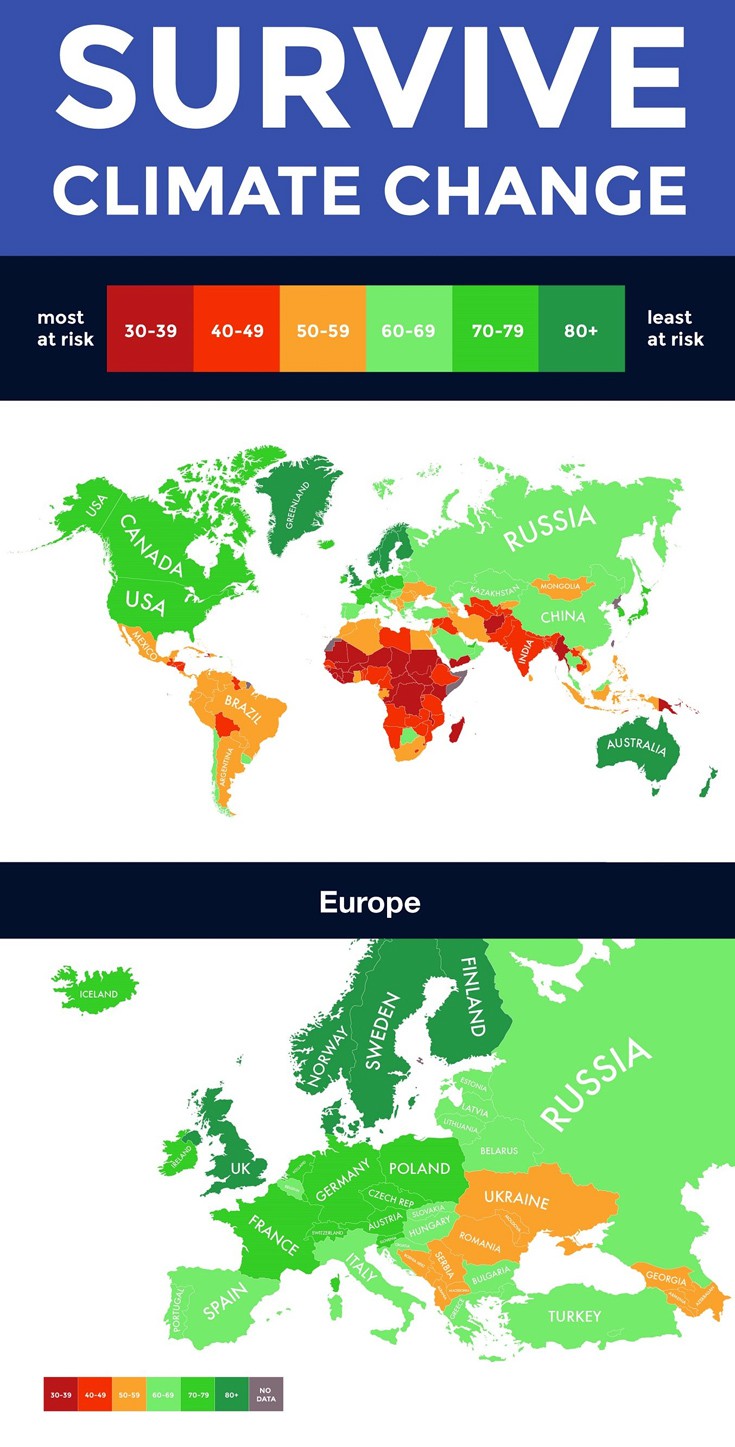 Οι υπεύθυνοι του Eco Experts δημιούργησαν ένα γράφημα με βάση πληροφορίες από το Notre Dame Global Adaptation (ND-Gain), μια ετήσια κατάταξη των χωρών που είναι σε καλύτερη δυνατή θέση να προσαρμοστούν σε έναν πλανήτη που βρίσκεται σε κίνδυνο.