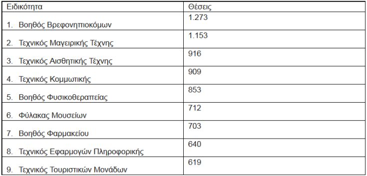 Ανακοινώθηκαν σήμερα τα ονόματα των 16.544 επιτυχόντων σπουδαστών στα Δ.ΙΕΚ. Οι περισσότερες θέσεις αφορούσαν τις ειδικότητες των βοηθών βρεφονηπιοκόμων, τεχνικού μαγειρικής τέχνης, αισθητικής τέχνης, όπως φαίνεται στον πίνακα που ακολουθεί.