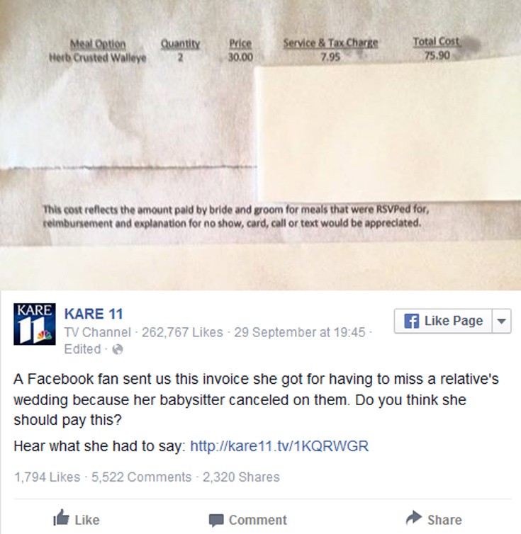 Η Jessica Baker έκανε κάτι «ανεπίτρεπτο». Δεν μπόρεσε να παραστεί στο γάμο φίλων της και καλείται τώρα να πληρώσει τον… λογαριασμό. Η γυναίκα από τη Μινεσότα των ΗΠΑ, ανέφερε στο KARE-TV ότι εκείνη και ο σύζυγός της, πρέπει να καταβάλλουν 75,90 δολάρια, ποσό που αντιστοιχεί στα δυο γεύματα που τους αντιστοιχούσαν στη δεξίωση (συν τους φόρους) που ακολούθησε μετά από το γάμο, σύμφωνα με τον σταθμό.