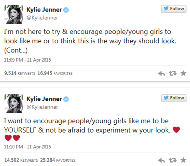 Χθες η Jenner παρενέβη στα τεκταινόμενα στα social media ενθαρρύνοντας τις θαυμάστριές της να είναι ο εαυτός τους και να μην μιμούνται το look της.