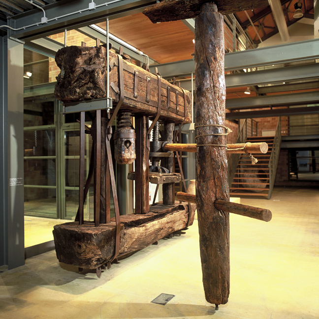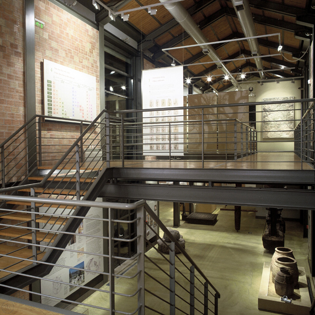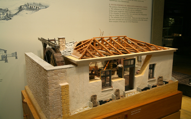 Στον κάτω όροφο συνεχίζεται η παρουσίαση της εξέλιξης της τεχνολογίας των ελαιοτριβείων στην Ελλάδα από τους μεταβυζαντινούς χρόνους έως το πρώτο μισό του 20ού αιώνα. Εκτίθενται μηχανισμοί που σώζονται ή/και έχουν αποκατασταθεί, καθώς και μεγάλες κινούμενες μακέτες, που βοηθούν τους επισκέπτες να αντιληφθούν τις παραδοσιακές τεχνικές παραγωγής του λαδιού. Η έκθεση πλαισιώνεται από ψηφιακές παραγωγές, ενώ στο χώρο του Μουσείου λειτουργούν επίσης κυλικείο, εκθετήριο, πωλητήριο και αίθουσα πολλαπλών χρήσεων.