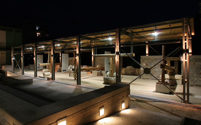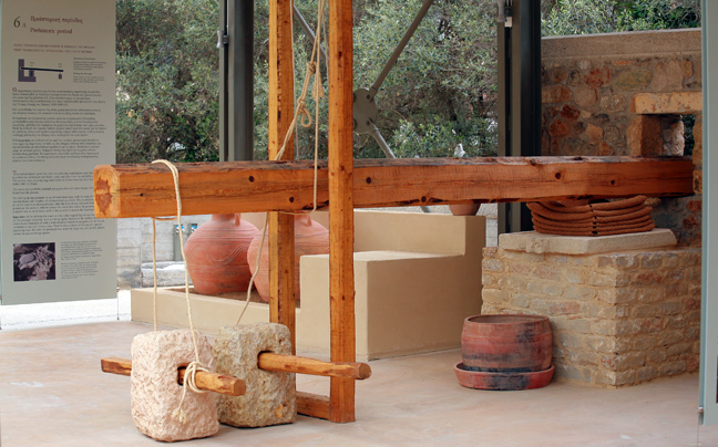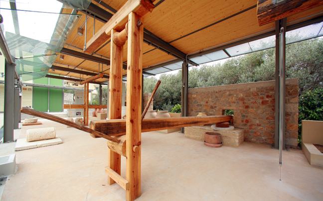 Στην υπαίθρια έκθεση γίνεται αναφορά στην ελαιοκαλλιέργεια και ελαιοσυλλογή, ενώ παρουσιάζονται επίσης τρία ελαιοτριβεία, ένα των προϊστορικών, ένα των αρχαίων και ένα των βυζαντινών χρόνων, τα οποία τίθενται σε λειτουργία στο πλαίσιο εκπαιδευτικών δραστηριοτήτων και προγραμμάτων.