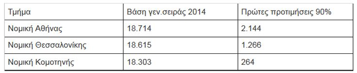 Η ζήτηση των τμημάτων, όπως άλλωστε γίνεται αντιληπτό και από τις βάσεις εισαγωγής, είναι από τις υψηλότερες. 3.674 συνολικά μαθητές είχαν τα τμήματα της νομικής ως πρώτη τους επιλογή ενώ 13.632 τα δήλωσαν στο μηχανογραφικό τους.