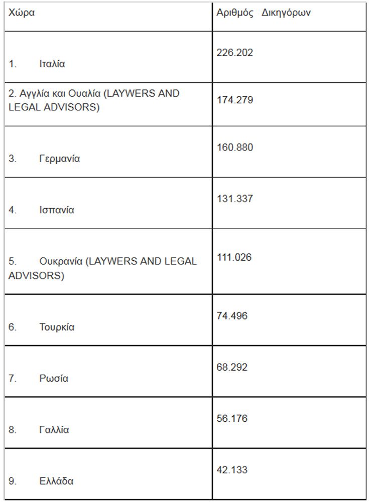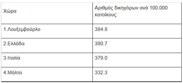 Δεύτερη η Ελλάδα σε αριθμό δικηγόρων ανά 100.000 κατοίκους.