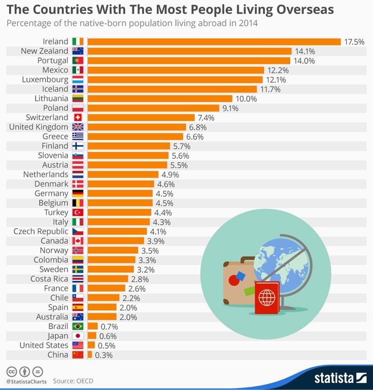 Στο διάγραμμα που αφορά το 2014, υψηλά νούμερα έχει και η Νέα Ζηλανδία και η Πορτογαλία με τα ποσοστά των ανθρώπων που έχουν γεννηθεί εκεί αλλά κατοικούν σε άλλες χώρες να κυμαίνεται στο 14,1% και 14,0% αντίστοιχα.