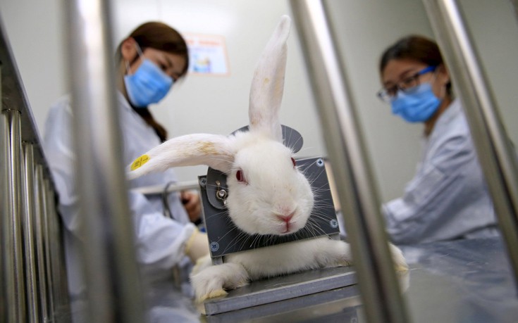 Καθηλωμένο στέκεται ένα κουνέλι στα εργαστήρια της πόλης Τιανζίν στην Κίνα, ενώ ερευνητές ελέγχουν τη θερμοκρασία του σώματος του πριν κάνουν πάνω του μια δοκιμή φαρμάκων.