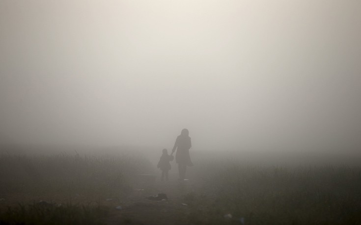 Μια γυναίκα περπατά κρατώντας ένα παιδί από το χέρι και διασχίζει την ομίχλη στον αυτοσχέδιο καταυλισμό κοντά στα σύνορα Ελλάδας – πΓΔΜ, στην Ειδομένη.