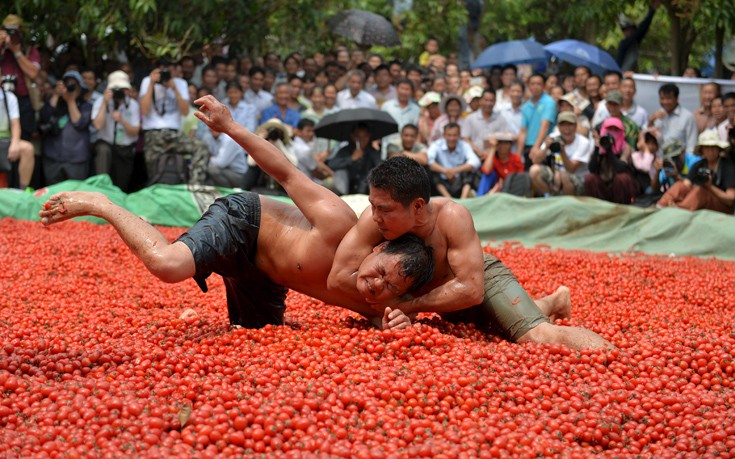 Το παραπάνω δρώμενο λαμβάνει χώρα στο τουριστικό και πολιτιστικό φεστιβάλ που πραγματοποιείται στην Αυτόνομη Περιφέρεια της Τίνγιανγκ, στην Κίνα. Το σκηνικό απλό αλλά... ευφάνταστο: Δύο άντρες παλεύουν μέσα σε μία πισίνα γεμάτη με ντομάτες.
