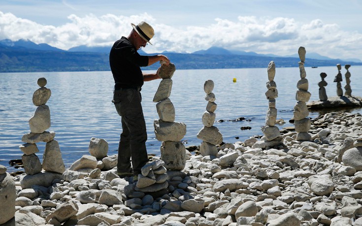 Ο καλλιτέχνης Daniel Dunkel χτίζει αγάλματα με πέτρες στην όχθη της λίμνης Lake Leman στην πόλη Λούτρι, κοντά στη Λωζάννη της Ελβετίας.