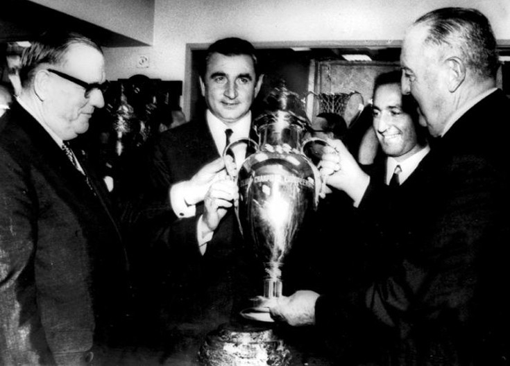Ο Μπερναμπέου παραλαμβάνει το ευρωπαϊκό κύπελλο μετά τη νίκη της ομάδας το 1965-1966