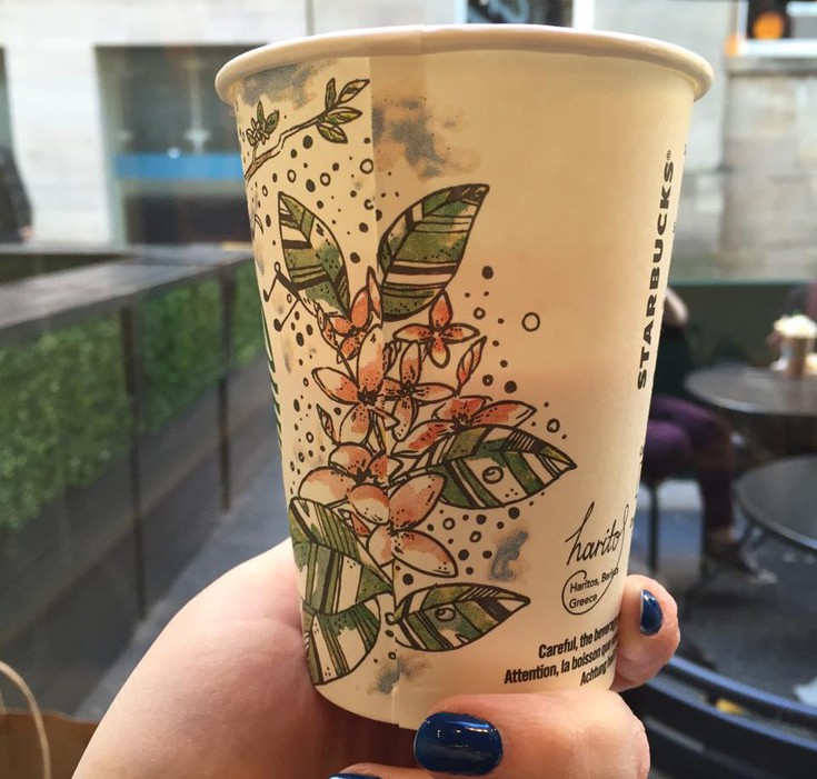 Ο Ηρακλειώτης, Χαρίτος Μουντουφάρης, διακόσμησε το μικρό μέγεθος ποτηριού της εταιρείας (tall). Παρά το γεγονός ότι δεν ασχολείται επαγγελματικά με το σχέδιο ή τη ζωγραφική, το σχέδιό του ήταν αυτό ακριβώς που αναζητούσε η Starbucks για να τυπώσει σε αμέτρητα ποτήρια, που φιλοξενούν τα ζεστά της ροφήματα.
