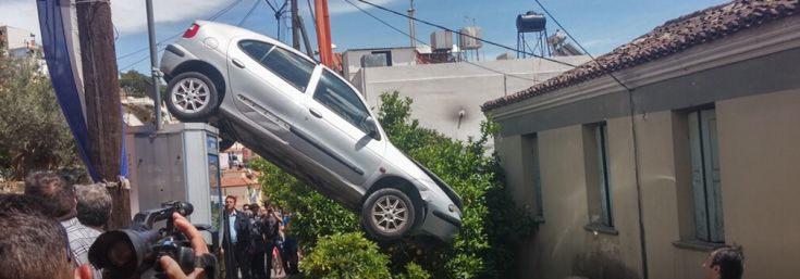 Σύμφωνα με την ΕΡΑ Αιγαίου, ένα όχημα που έβγαινε από παράδρομο, χτύπησε το προπορευόμενο επί της Ζωοδόχου Πηγής όχημα με αποτέλεσμα αυτό να καρφωθεί κάθετα στην αυλή του σπιτιού.