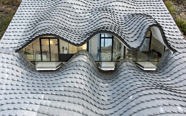 Με την καμπυλώδη στέγη του, τα μεγάλα παράθυρα και την εξωτερική πισίνα, το ασυνήθιστο σπίτι αποτελεί από μόνο του εντυπωσιακό θέαμα.